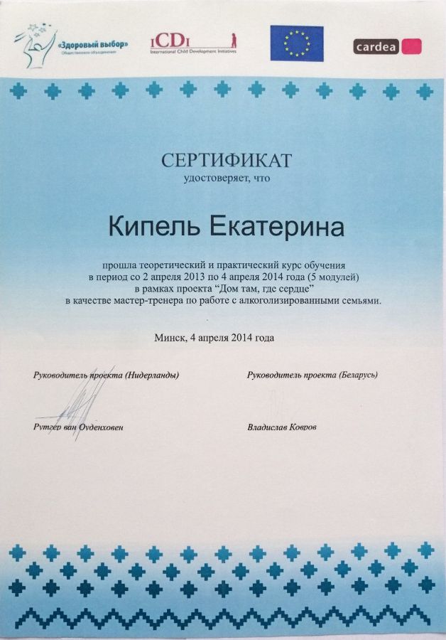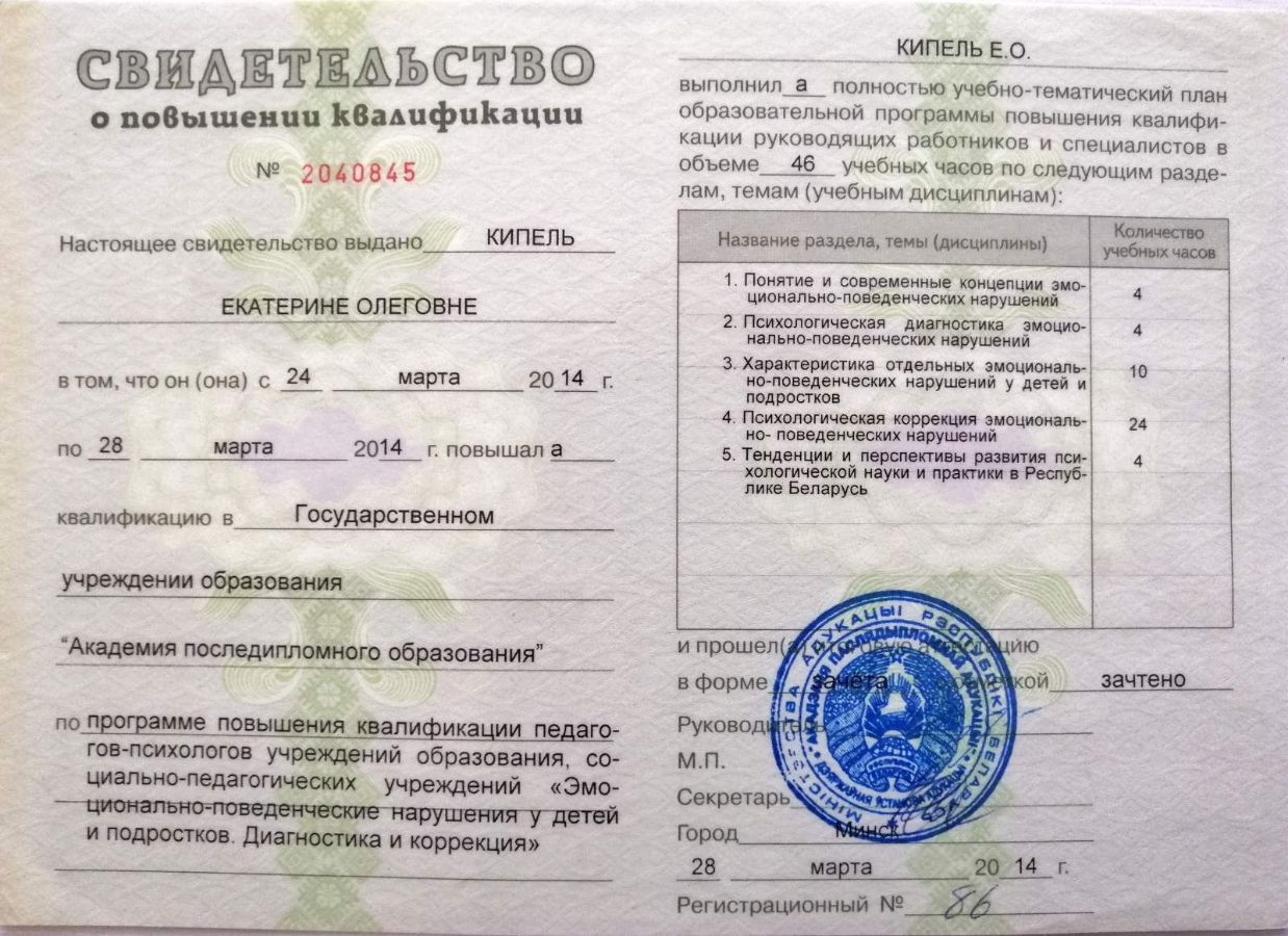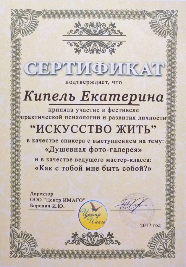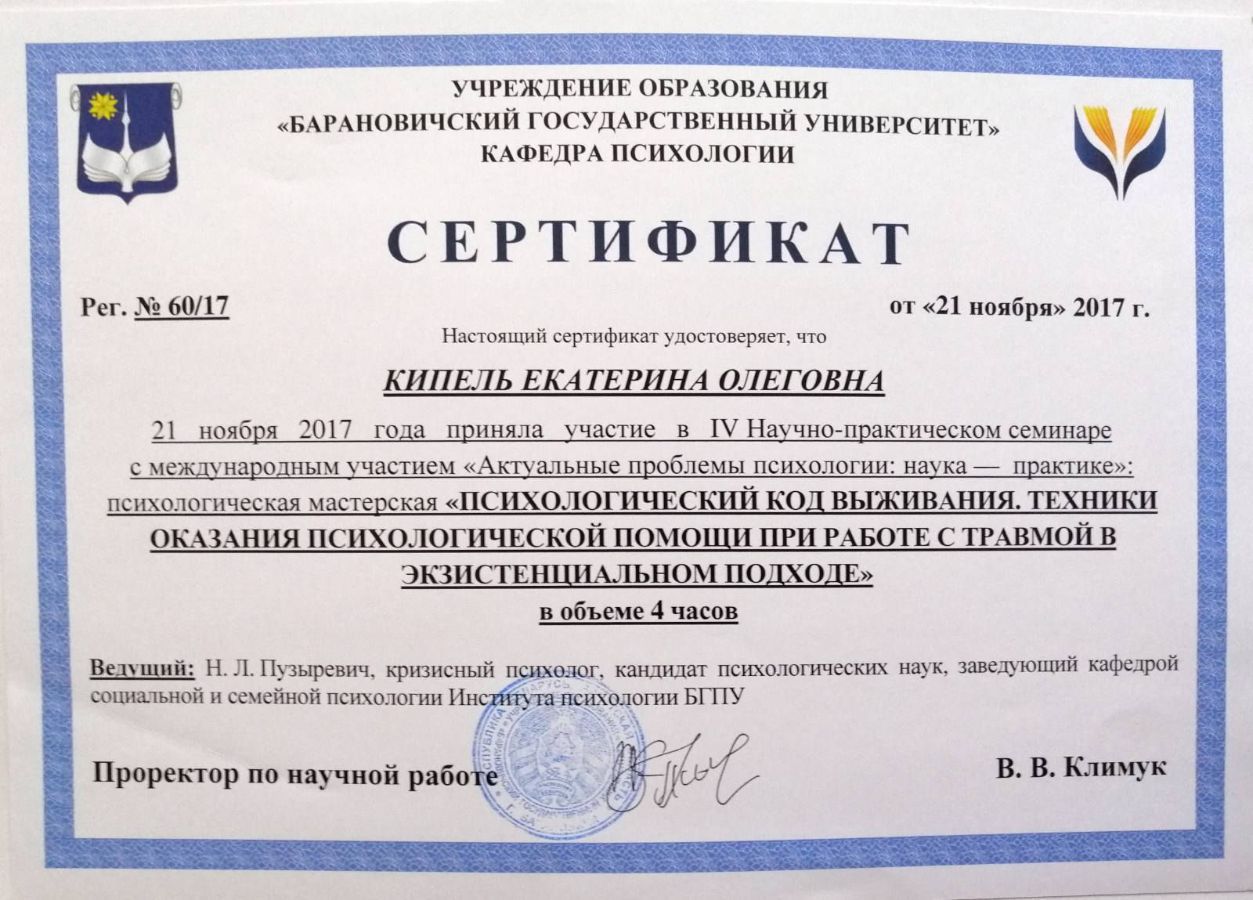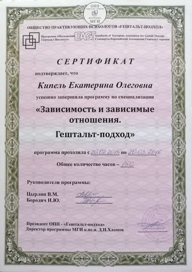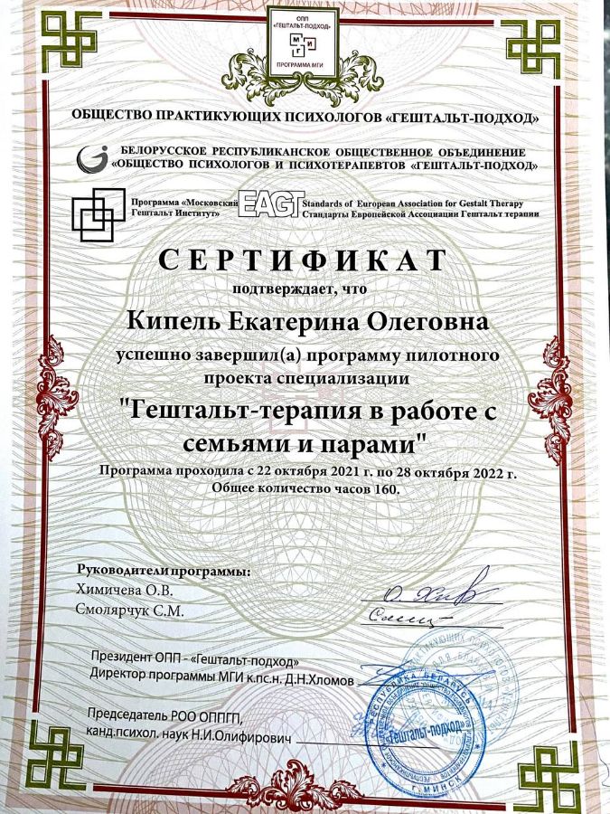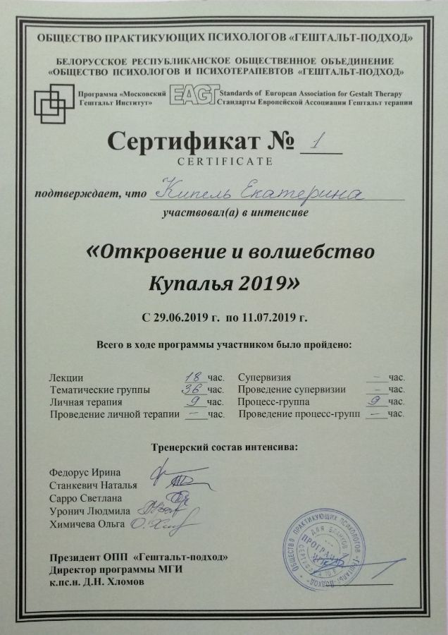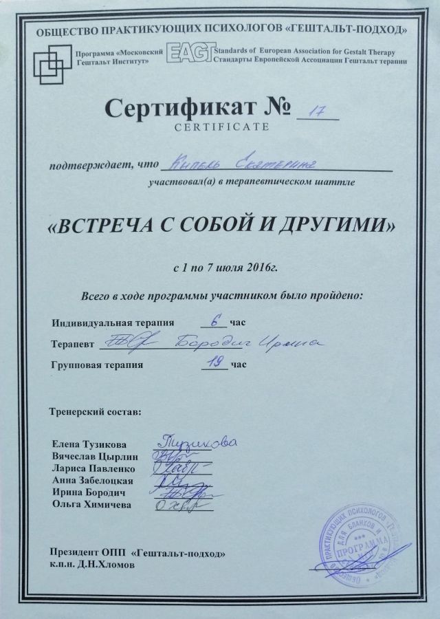 Аккредитована в качестве супервизора Общества Практикующих Психологов «Гештальт-подход».